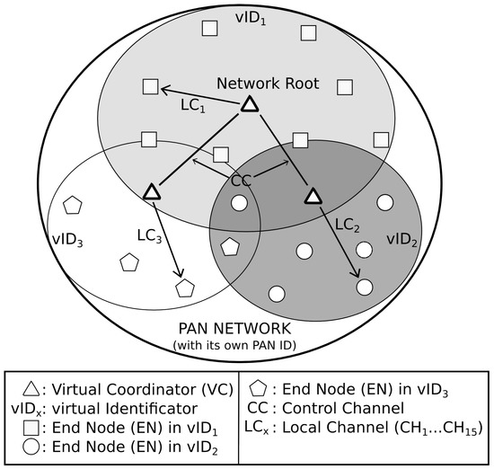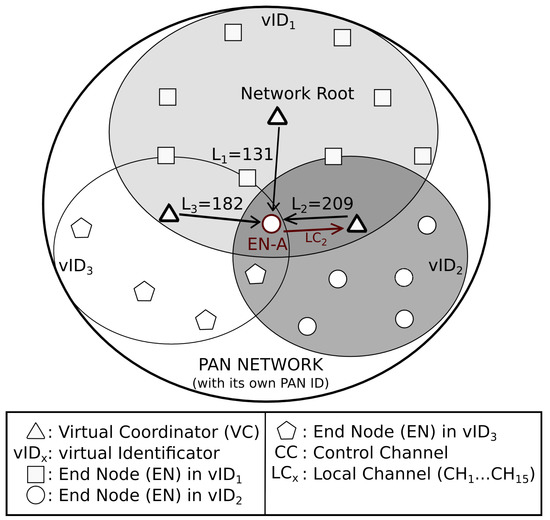 DARAL can be described as a centralized non-beaconing routing algorithm based on dynamic clustering, which is achieved using the sub-network concept. A node must be defined as the network root or coordinator. Its neighbour nodes can connect to it using different roles, either as end nodes (ENs) or as virtual coordinators (VCs). Each VC is responsible for creating and maintaining a sub-network that is identified with a virtual identification (vID) as was described in [24]. A node will be treated as an EN when the link quality between it and its coordinator is higher than a certain threshold. If the quality is worse than this value, the node acquires the role of virtual coordinator, which will try to expand the network, creating a sub-network around it. Each VC can be connected to new ENs or VCs, producing a multi-level hierarchy of sub-networks. Therefore, the network is similar to a tree topology, where VCs are the element of a branch and ENs act as leaves in the tree. The dynamic role selection process (DSRP) is the most important aspect of the network formation. The appropriate number of VCs will depend on the scenario, so the threshold level is adaptable to each deployment.
