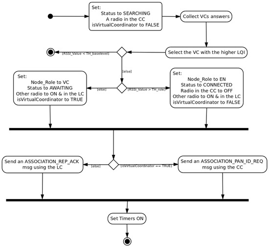 Despite the fact that the role selection is still based on the link quality indicator between a VC and an EN, mDARAL leads to several minor changes in this process. When an EN starts to send an Association Request message waiting for an answer of a VC, it uses the control channel (CC) as it is set as the standard pre-defined communication channel. VCs include, in the Association Reply message, information about the secondary channel or local channel (LC) use within its sub-network, being the information stored for the selection process. Consequently, once a node has selected a VC as a parent, it turns off its primary radio and sends the Association Reply Acknowledgement through the secondary radio using the local channel information received during the association polling process. Figure 2 shows a graphical UML (Unified Modeling Language) description of the algorithm, including the radio status changes.