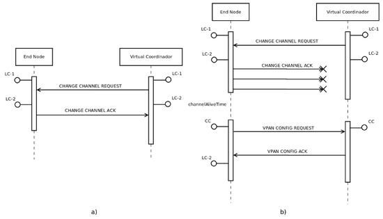 Finally, it is necessary to consider the possibility of a connectivity problem due to the channel migration. Therefore, a node, which is connected to a certain sub-network, could request the sub-network configuration anytime, using the CC and the messages VPAN Config Request and VPAN Config ACK (see the Appendix A for further information). In both cases, the VPAN (Virtual Private Ad hoc Network) concept is related to the sub-network created, and it is identified as vID (virtual identification).
