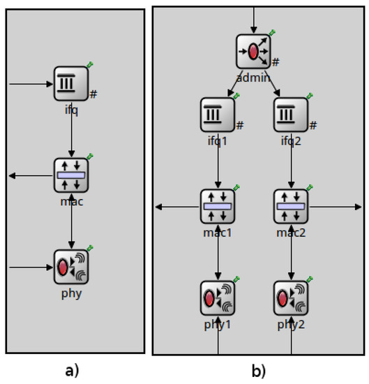 - NIC Module: This module contains all the layers related to the IEEE 802.15.4, MAC and PHY (Physical) layers, and a queue module, which manages the packets received from upper layers. Now, the NIC module contains two of each sub-modules and an additional sub-module to evaluate and assign the packets from the upper layer to a certain radio, as it is shown in Figure 5b.