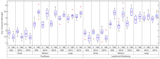 Attending to the obtained results in terms of number of messages (see Table 3 and Figure 6), mDARAL gets a larger amount of them except in small networks, during network set-up compared to DARAL, which is completely reasonable taking into account how mDARAL manages the connection messages. Analyzing the scenario formed by a large number of nodes with a node density of 15, it is noticed that DARAL needs 3.09 messages per node during the set-up compared to the 3.38 messages used by mDARAL for the Freespace propagation configuration. On the contrary, when the Log-Normal Shadowing configuration is used, both approaches reduce the average number of messages during the set-up with 3.91 and 2.91 for mDARAL and DARAL, respectively. Despite the number of messages being larger for mDARAL, during network set-up, the energy consumption is not penalized by this circumstance, as mDARAL optimizes the use of batteries under all testbed scenarios, especially when a Log-Normal Shadowing with a large number of nodes and node density equal to 15 is deployed.