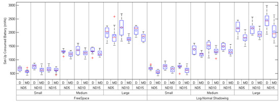 Average battery consumed during the network set-up of Daral (D) and mDaral (MD) for small-, medium- and large-size scenarios under different propagation conditions and node densities (ND5, ND10 and ND15).
