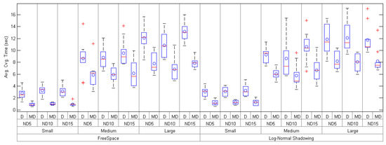 Average convergence time of Daral (D) and mDaral (MD) for small-, medium- and large-size scenarios under different propagation conditions and node densities (ND5, ND10 and ND15).