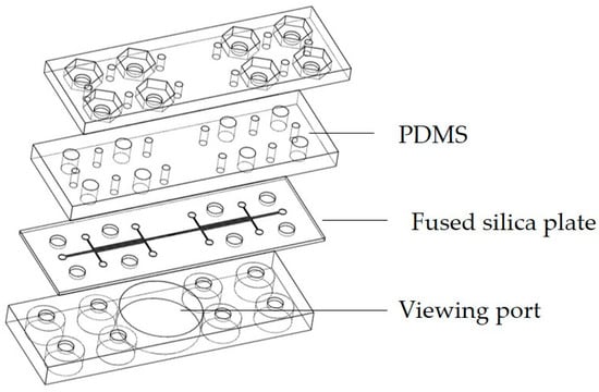 Illustration of the layered microfluidic device. Top and bottom plates were 3D printed with holes to accommodate #8-32 screws. The bottom plate is equipped with a viewing port for an inverted microscope. The second layer from the top is made of PDMS. The second plate from the bottom is the fused silica microfluidic plate.