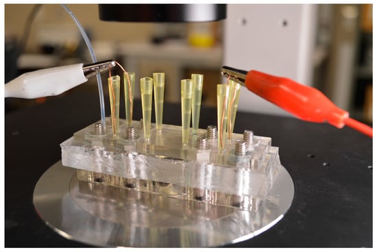 Polytetrafluoroethylene (PTFE—#20 AWG) tubing (Cole Parmer, Vernon Hills, IL, USA) was used to fill the sample and electrode channels. Two hundred microliter (Thermo Fisher Scientific, Waltham, MA, USA) pipette tips were trimmed to provide space for the microscope condenser and inserted through the PDMS to act as reservoirs for the liquid electrode channels. The sample consisted of 0.005× PBS (ScyTek, Logan, UT, USA), 0.1% TWEEN 20 (ScyTek), and 3.3 μm polystyrene fluorescent spheres (Thermo Fisher Scientific) at a concentration of approximately 2 × 107 particles per milliliter. The sample had a conductivity of 40 μS/cm. Liquid electrodes were filled with 1× PBS with a conductivity of 15 mS/cm. Dilute 3,3′-diethylthiatricarbocyanine iodide (DTTC) dye (Sigma-Aldrich, St. Louis, MO, USA) at a 250 μM concentration in 1× PBS was added to the liquid electrodes to aid in visualizing during priming of the channels. The final concentration of DTTC in the channels was approximately 1 μM after inserting the pipettes filled with 1× PBS. Copper wires (28 gauge) were used to connect the electrodes spanning over the sample channel as shown in Figure 3.