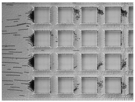 Image of cDEP device under operation (350 VRMS, 100 Hz, 5 μL/h), trapping polystyrene spheres with a diameter of 3.3 μm. Square pillars are 100 μm by 100 μm.