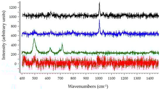 Raman spectra of 3.3 μm PSS trapped within the cDEP device (black), PSS on quartz coverslip (blue), PDMS (green), and the quartz coverslip with 0.005× PBS (red). The spectrum of PSS on a quartz coverslip (blue) is the positive control. The spectra of PDMS (green) and the quartz coverslip without PSS (red) are negative controls.