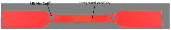 The proposed strain monitoring system consists of an externally mounted pressure sensor connected to a 2 mm diameter capillary integrated into the test section of the tensile test sample. The extensometer measured the strain in the same test section as the integrated capillary. Alongside this first connection, an additional external connection was added to ease the filling of the capillary, flush the channel, and check that the capillary was not clogged. These connections were threaded using M5 HeliCoil’s
