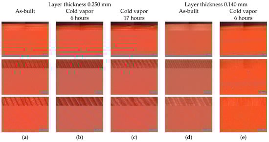 Figure 3a–c, show the bottom side of the tensile test samples (side build plate) in as-built condition, and those that were externally exposed to cold acetone vapor for 6 h and 17 h. It is clear that the cold vapor treatment has modified the surface roughness by blending together adjacent layers.