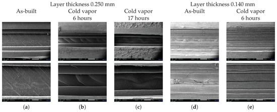 Figure 4a–c shows Scanning Electron Microscope (SEM) images of the inner surface of the capillary inside the tensile test samples with layer thickness of 0.250 mm for different after-treatment processes.