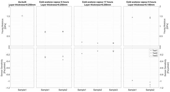 Figure 5 show a comparison between the as-built condition of ABS material with a layer thickness of 0.250 mm, and after a 6 h and 17 h cold acetone vapor treatment. It is clear from these results that, although a proper acetone treatment is required to obtain a sealed capillary for the strain measurements, long exposure to cold acetone vapor led to a drastic reduction of the Young Modulus and, as a consequence, poor performance of the strain measurement sensor. It was observed that the capillary walls were sucked inwards, which can be seen as the dark sinusoidal irregularities in the capillary wall depicted in