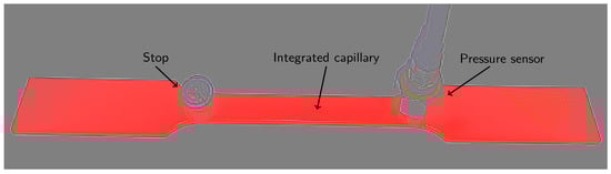 The embedded capillary is filled with air or water and becomes pressurized when deformed during tests. The embedded capillary must therefore be air- and watertight, which largely depends on the choice of material and production process used. Acrylonitrile butadiene styrene (ABS) is a typical material used for the FDM process and can be made water-impermeable. As printed, the ABS material deposited in layers or as strands is incapable of holding water. In particular, for a (micro) fluidic design with imprinted channels and network geometries this issue is critical. The layers do not blend together to create a watertight device, with small gaps and holes in between the deposited material [