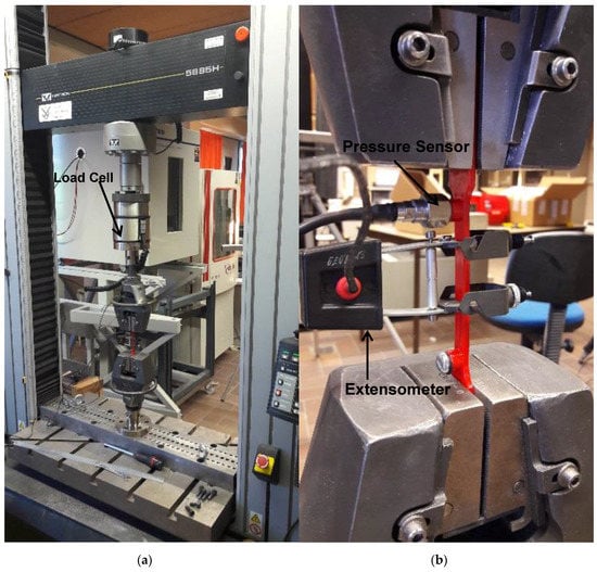 The tensile test samples were placed in an Instron 5885 H (Instron, Norwood, CA, USA) tensile testing machine with Instron 2518-103 load cell (10 kN static). An Instron 2630-030 extensometer was furthermore installed on the test section. The pressure sensor, extensometer, load cell and cross head displacement were all recorded using an LMS Scadas III mobile data acquisition system (Siemens, Munich, Germany). All channels were synchronously sampled at a rate of 6.4 kHz. The applied loads were limited to induce low strain levels comparable to the typical elongation of Ti6Al4V at yield: