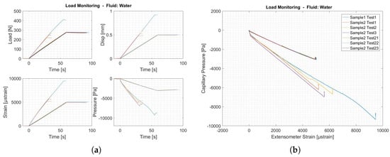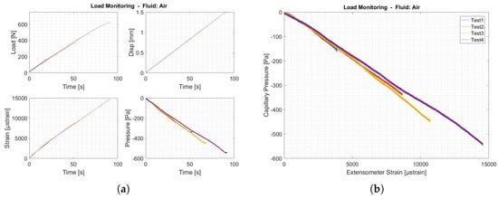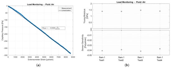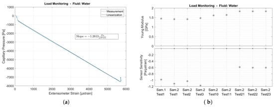 Figure 9a shows a linear relationship between the strain measured by the extensometer and the pressure variations measured by the load monitoring system, except for both ends of the tests where non-linear behavior was observed. As soon as the crosshead started moving, the pressure dropped by approximately 500 Pa, which was recovered when the crosshead stopped moving. In between, the curve fits very well to a linearized curve with slope −1.2613 Pa/µstrain, which is about 32 times more sensitive than the case where the capillary is filled with air.