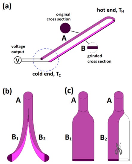 For most of the samples used in this work, each individual sample was made from one piece of long wire of a specific material, and these wires had a diameter which ranged from 0.5–2.0 mm. In each sample, part of the wire was kept in its original shape, and the rest of it was grinded, split, or pressed, so its cross-sectional area was reduced to ¼–½ of the original wire. For the soft wires of Cu, brass (Cu-Zn), Zn, Ti, Mo, and W, each sample was bent into a “U” shape, where the thick arm of the sample was kept as the original wire diameter, but the thin arm was thinned with an electrical grinding wheel, or mechanically with a grinder and sand paper. Figure 1a shows such a sample configuration. The turning part of the sample serves as the junction region or the “hot end” in the following measurement process. For hard W wires, bending over 180° usually leads to a broken bending section. So, we kept W wire samples straight in shape, but half of the long wire of each sample was mechanically thinned using a grinder, and the testing hot end was chosen at the joint part of the thin and thick arms.