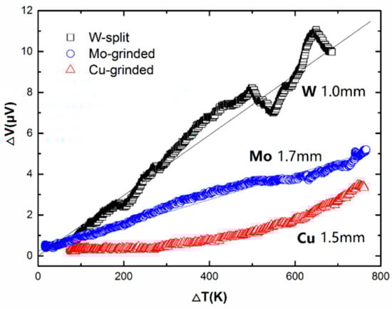 By rough linear fitting, the slopes for the data of the Mo sample and the W sample produce slopes (i.e., ΔS) of 0.006 μV/K and 0.015 μV/K, respectively. The slope for the data of the Cu sample is close to zero when ΔT is small, and increases to 0.010 μV/K at ΔT > 600 K, with an average ΔS of ~0.005 μV/K.