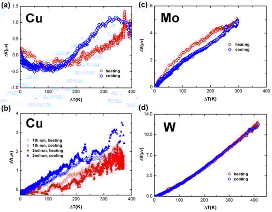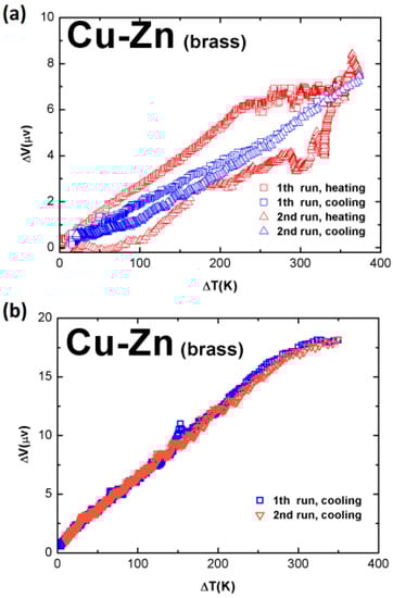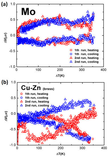 Figure 6b presents a typical result measured from an “identical wire” couple of a 1.0 mm diameter, 1.0 m long brass wire. Here, the same pattern is shown as in Figure 6a, and the measurement electrodes were exchanged for the second run. The difference gradually increased with increasing ΔT, and at ΔT = 330 K, ΔV was around 1.0 μV, which we considered as a system error.
