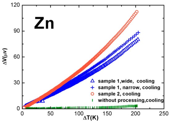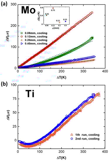 Similarly, Figure 8b presents a typical result measured from two Ti wires, where the thick one is 0.6 mm in diameter, and the thin one is 0.2 mm in diameter. The slope is about 0.33 μV/K. It shows a change of sign at ΔT ≈ 50 K, and exhibits a roughly linear behavior at higher ΔT.