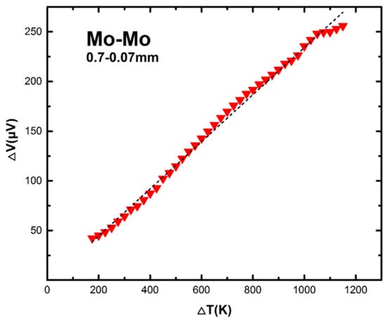 Measurement results for a sample made for two pieces of Mo wires with diameters of 0.07 mm and 0.7 mm, respectively. It shows a roughly linear response in the voltage output over a large temperature difference between the hot and cold ends up to 1200 K.