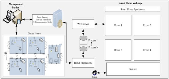 The household appliances are fixed at specific places and they are discovered with the help of specific ids assigned to the sensors that are controlling the appliance. Each new appliance is first registered with a sensor in the MS. Therefore, every HTTP request for an appliance always passes through the MS. Appliance registration in the MS reduces the performance degradation caused by the device discovery process. In order to make the proposed framework work as fast as possible, the proposed RESTful API always communicates with the MS. The MS works as a bridge between the web and the household appliances. Apart from the household appliances control, the working of the RESTful API framework is divided into two modules, i.e.: (1) Process Management Module and (2) Presentation Module. Multiple requests for a single household appliance are divided into multiple processes. Similarly, each process is assigned an ID that distinguishes the respective household appliance/s or sensors deployed in the WoT-ESN. A process is alive until the household device is functioning properly. Once the household appliance is removed from the home, the process terminates autonomously. Whenever a client generates a request, the process of the respective household appliance redirects the request to the resource repository available in the MS. This gives the user many options to retrieve information. For example, if a client requests the energy consumption information of a household appliance, the process shows monthly energy consumption and current energy consumption. Thus, the home users can customize the information to be displayed from the process management. Moreover, multiple clients can generate more than one process for a single household appliance. However, a smart home user can only access services of his own home WoT-ESN. The multi-processing functionality supports multi-user environments, while facilitating a smooth and user-friendly environment for the WoT-ESN. Moreover, the presentation module provides accessibility to the RESTful API from the Web. The smart home users can use any web-browser to view the status of their smart home WoT-ESN owing to the integration of RESTful WoT. Each household appliance is represented as a hyperlink with the name of the appliance. The user can explore the desire services by clicking the links of the respective appliance. The entire web architecture of the smart home is shown in Figure 1.