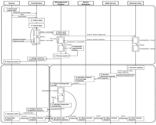 The sensor performs service resolution and executes the event, i.e., getting the room temperature, and setting refrigerator cooling. Accordingly, the sensor generates the service response at the completion of the event. Consequently, the event response is sent back to the MS and it will traverse the smart gateway, RESTful API architecture, and Web server to serve the user request. While routing the response, the MS updates the appliances’ or sensors’ status and energy consumption parameters. Finally, the smart gateway wraps the service response that can be viewed by the respective user via a Web browser.