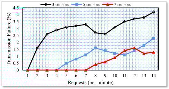 The division of the requests in processes highly reduced the response time even if the requests are for the same household appliance. Moreover, each request is routed through different paths to check the effect of the multi-hop environment. Whenever the sensors are available at a closer distance to each other, there are greater chances of interference. Therefore, there is a high chance of failed attempts to send the requested data to the Web. In order to simulate a similar scenario, the sensor nodes available in the smart home scenario depicted in Figure 1 were divided into four groups. The groups 1, 2, 3 and 4 are available 3, 6, 9 and 12 m apart from each other. The group of sensors available 3 m apart from each other is highly affected by the interference and therefore, the failed transmission attempts in such scenarios are very high. The number of failed attempts when the number of requests reaches to 120/minute is more than 10%. However, the number of failed attempts significantly decreases when the physical distance between the sensors is more than 3 m. A similar scenario with three sensor nodes and multiple requests per minute is depicted in Figure 4.