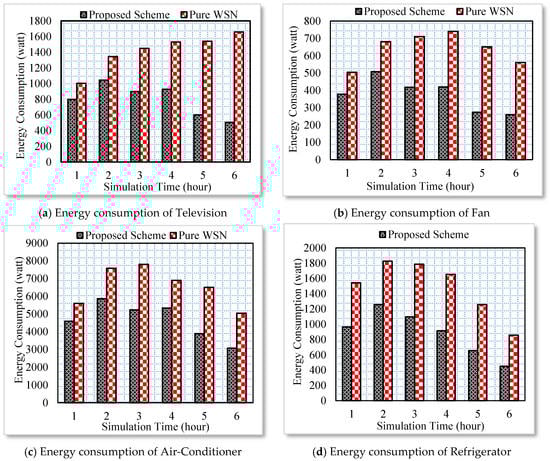 In this section, four different home users are interacting with various household appliances. They are programmed to randomly switch off and on a household device randomly. In order to be more realistic, the smart home user does not switch off most of the household appliances. Therefore, the user can check its status on the Web and can send a switch off request to the particular household appliance. A drop-down box with several records such as appliance status, energy consumption per day and month, and the number of times a device is switched off and on during a day is provided with each appliance. Those records help a user to tune the energy consumption of an appliance to optimal conditions. The proposed architecture is tested against a pure WSN. In the pure WSN scenario, the household appliances are directly controlled by the sensors. Whenever a user is not available in a scenario, the sensors automatically switch off devices. However, such systems do not perform actions based on the user context. Therefore, a pure WSN requires proper tuning of sensors for each new appliance. Such practices are only possible for controlling lights and home temperature. However, these WSN services cannot be integrated into real time scenario where the smart homes highly depend on user activities. In other words, the traditional WSN services cannot guarantee efficient services in the case ESN. The energy consumption of four different appliances, i.e., a television, fan, air-conditioner and refrigerator is shown in Figure 6a–d, respectively. In the case of proposed scheme the household appliances are controlled from the Web following a user context. However, in the case of pure WSN, the appliances are switched off and on considering the appliances’ operating time. The results show significant improvement in the context of energy consumption in the case of the proposed scheme. At average 15% to 20% energy is saved with the proposed system.