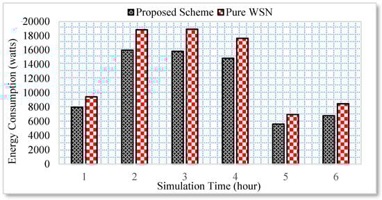 Similarly, the energy consumption of all the electronic appliances under the proposed scheme and a pure WSN scenario is compared for a duration of six hours. The user activity is random. For example, a user can go to any room or kitchen and switch on a household appliance. Unlike pure WSN, the household appliance is switched off following an approval from the user through the Web. However, if a user is not available at the moment, the user previous context is utilized in this case. The results reveal that an average of 15% energy is saved in the case of proposed scheme as shown in Figure 7.