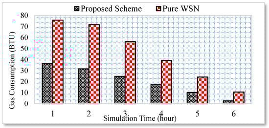 A home user normally requires approximately 110 to 120 liters of water per day. Therefore, controlling the consumption of water optimizes the water usage per day. However, the traditional WSN architecture does not care about the user context and, therefore, a high amount of water is consumed due to the inappropriate usage. Similarly, the gas consumption is measured only for the burner in the kitchen. The rest of the gas consumption used for heating, etc. is not tested in this scenario. Initially, the home user used the kitchen for more time. However, with the passage of time the usage gets reduced. Thus, the energy consumption is significantly reduced following the proposed semi-automated model.