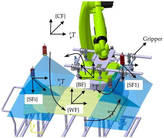 - For an initial part, an initial grasping path was taught, along which the robot could grasp the initial part precisely. And pose of the initial part relative to SF1 () was measured and recorded. As shown in Figure 1, the part pose relative to SF1 can be given as follows:where is the transform relationship between SF1 and BF; is the transformation between BF and CF; and is the transformation between CF and the initial part frame (WF). Then, for a practical part that has a pose deviation with the initial part, the robot takes the camera to measure the part along the measuring trajectory, and determines the pose of the part relative to SF1 (), which can be given as follows:As the industrial robot is fixed in the station, transform relationship between BF and CF () is invariable. Also as the camera system adopted in this method has a wide field of view, it can include the featured points on the practical deviated parts at the same robot pose. Because of the high repeatability of the industrial robot, the pose of SF1 relative to BF () can be regard as fixed.