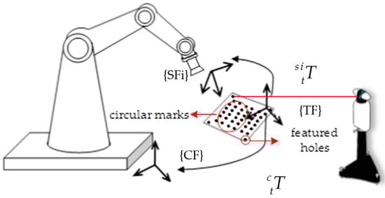 After the robot’s measuring trajectory has been taught, pose of the camera measuring pose frames (SFi) need to be calibrated. As coordinate system of a camera is defined based on its optical structure, which cannot be measured with the laser tracker directly. In this paper, the camera pose frames were calibrated based on homography and principle of rigid body transformation, which was illustrated in Figure 2. A calibration target with circular marks and several featured holes is adopted, the target frame (TF) is defined by the featured holes and the circular marks have been calibrated in the target frame. When the camera stops at a measuring pose, it captures image of the calibration target, the transform relationship between SFi and the target frame can be calculated with the homography, and the target frame can be measured by the laser tracker. Then the transform relationship between SFi and CF can be calculated as follows: