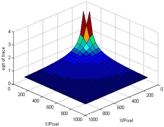 As we can see in Figure 5, when the featured point moves far from the principle point, the influence of the uncertainty of the image points become less, but the decrease trend becomes slower when the distance is more than 400 pixels (the simulated camera has a resolution of 2456 × 2058). When applying to the actually engineering project, in consideration of lighting conditions and other factors, we suggest that the featured points image at about 1/4 length away from the edge of the image plane.