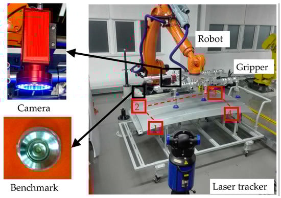 In a robotic loading workstation, the robot grasps components or parts from work bins or shelves and then assembles them onto the car body. Components and parts vary in size and differ in shape, as small-sized parts such as a top rail or a wheel fender may be less than 0.5 m × 0.5 m, while large-sized parts such as a roof or a side-wall may be larger than 2 m × 1 m. As there are no precise positioning devices for work bins or shelves, i.e., the poses of the parts are usually uncertain, the position deviation between different parts can be as large as ±50 mm. In order to determine the pose of each part and guide the robot to grasp it precisely, a camera is mounted on the robot end-flange to measure the pose of the part, then the robot will adjust the pose of the gripper according to the measured part pose.