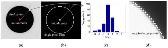 This section simply introduces the image processing method of subpixel edge extraction and ellipse fitting. First, for an original image (shown in Figure 7a), by threshold division and simple morphology, the connected domain of the ellipse is extracted and the single pixel edge of the ellipse is obtained using erosion (shown in Figure 7b). Then the initial center of the ellipse can be obtained by fitting the ellipse with the least-square method (white point in Figure 7a,b). For each pixel of the edge, along the direction of the pixel and the initial center (L in Figure 7a,b), the gray gradient (shown in Figure 7c) can be calculated, and the subpixel edges can be obtained by gravity method of the gradient (shown in Figure 7d). At last, the high-accuracy ellipse equation in pixel image is calculated by fitting ellipse with the least-square method again, and the final center is obtained (red point in Figure 7a).