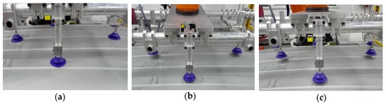 As we can see in Figure 6, the gripper for the car roof consists of a steel structure and several pneumatic chucks, and the curved surface constructed by the chucks is consistent with the roof surface. When the roof was at the initial pose, an initial robot grasping path was taught and each of the chucks fit closely to the roof surface, as shown in Figure 8a. If the roof does not deviate from the initial pose, the gripper could grasp it repeatedly along the initial path. In this experiment, we put the roof in several arbitrarily poses, and when the robot moved to grasp the roof along the initial path, chucks would deviate from the taught positions and not fit to the roof surface, as shown in Figure 8b, that is the roof cannot be absorbed. Then the part pose was determined with the method proposed in this paper and the robot grasping path was corrected based on the principle described in Section 2.1, the corrected robot grasping pose was shown in Figure 8c. Note that the chucks of the gripper was right above the absorbing positions and not fit to roof fully in Figure 8c, this is because we have stopped the robot moving to the final position in order to show a comparative effectiveness with Figure 8b.
