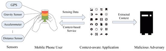 Currently, most privacy protection techniques for mobile applications focus on location protection, neglecting the diversity of users’ privacy and different degrees of users’ context sensitivity. Limited research on context privacy preservation are MaskIt [,]. MaskIt [] introduces an approach to filter a user context stream that provably preserves privacy, a privacy check deciding whether to release or suppress the current user context. However, the adversary is only allowed to make a fixed attack and cannot adjust its strategies according to different context sensitivity; while in the real world, the adversary will adapt its attacking strategies to different situations for achieving better profits. For example, advertisers may push hotel advertisements if they have inferred that a potential user will go to a new city. The work in [] overcomes this shortcoming and considers a more sensitive and realistic adversary in its framework of context privacy protection. It uses a two-player game formulation involving a mobile phone user and the adversary to analyze the context privacy problem. Unfortunately, both [,] do not realize the important role that the application plays.