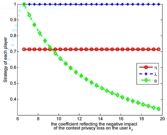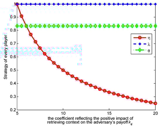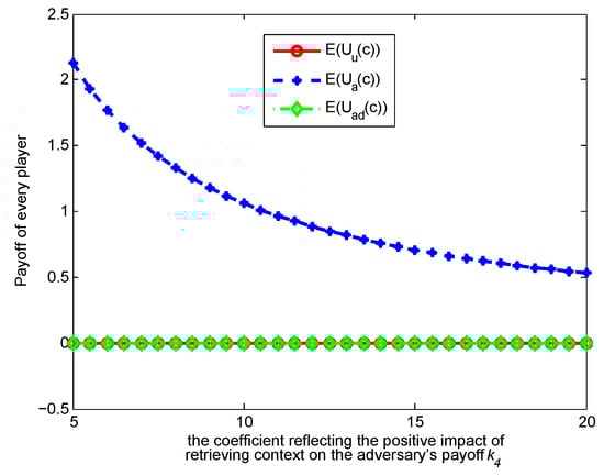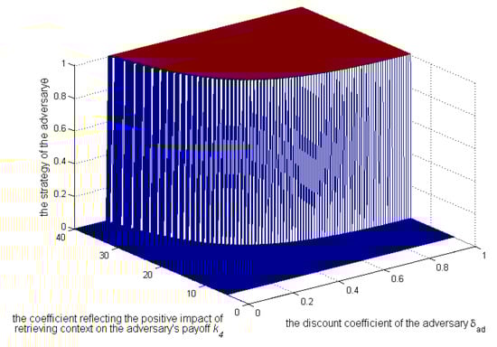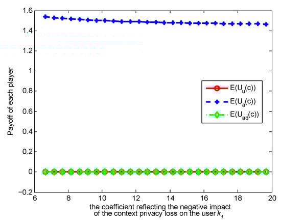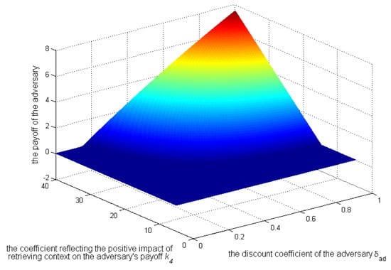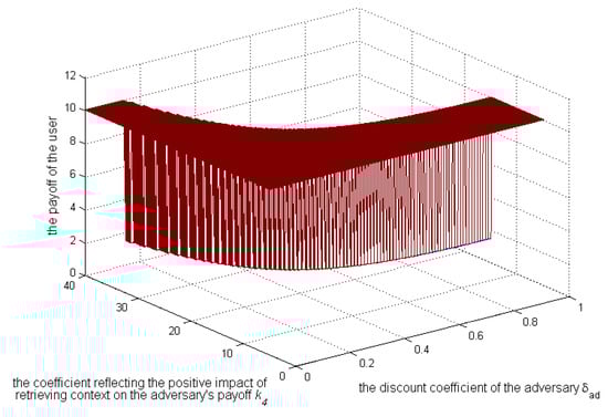 Figure 10, Figure 11 and Figure 12 show, when and , how the strategies and payoffs of adversary and user’s payoff change as and change. The results show that the adversary’s strategies will change from 1–0 when is less than a certain value, which depends on . Specifically as increases, the critical value will decrease, which is coincident with Equation (22). Besides, Figure 11 shows that the payoffs of the adversary when he or she does not take the initiative to retrieve contexts will be more than those when he or she does. Therefore, the condition of the adversary in not deviating from the social norm is that is smaller than a critical value. In this case, the payoffs of the user will also increase, as shown in Figure 12.