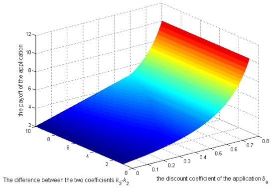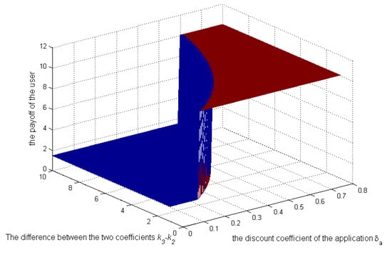 Then, let us see the numerical analysis in the repeated game. Figure 7, Figure 8 and Figure 9 show, when and , how the strategies and payoffs of the application and the user’s payoff change as and the difference between the two coefficients and change. Figure 7 shows that the application’s strategies will change from 1–0 when exceeds a certain value, which depends on . Specifically, as increase, the critical value will increase, which is coincident with Equations (22) and (23). As illustrated above, is the coefficient reflecting the negative impact of selling context on the application’s credibility. Because the application’s credibility depends on the user’s impression on the application, can be controlled by the user to protect its privacy. Figure 7 reflects that when remains unchanged and is increased by the user, the application’s strategy becomes zero more easily, requiring a smaller . Even though the application’s bad behavior has a small effect on its payoff in the future, it will tend to behave well, not leaking the context. From Figure 8 and Figure 9, the payoffs of the application and the user will always increase as increases. Simultaneously, the two figures respectively reflect that when remains unchanged and is increased by the user, the payoffs of the user and the application increase more easily as increases, requiring a smaller to increase the payoffs. Even though the application’s bad behavior has a small effect on its payoff in the future, the payoffs of the user and the application still increase. Additionally, from Figure 8, when is equal to the critical value, the payoff of the application to leak context and that of not doing so to will reach the same value. Furthermore, when is larger than the critical value, the payoff of not leaking contexts will be larger than the payoff of leakage, that is to say, letting be larger than the critical value is the condition of the application not deviating from the social norm.