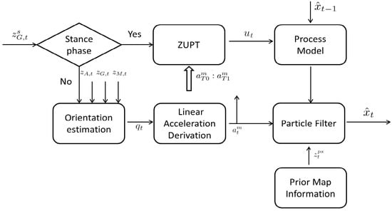 Figure 2 depicts the work flow of the proposed position estimation method. Once a stance phase is detected, it will fuse ZUPT and map information using a particle filter to estimate the pedestrian position for the previous non-stance phase. Detailed descriptions of each part of the method is given below.