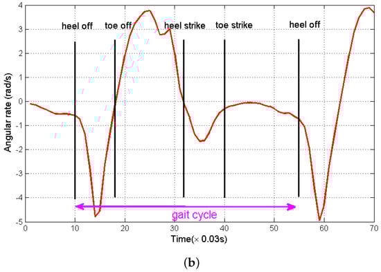 where is the gyroscope reading in the sagittal plane at time t, is the sampling interval (which was set to 0.01 s in our implementation), and are the predefined positive thresholds which are set empirically to 0.5 rad/s and 0.25 rad/s2, respectively.