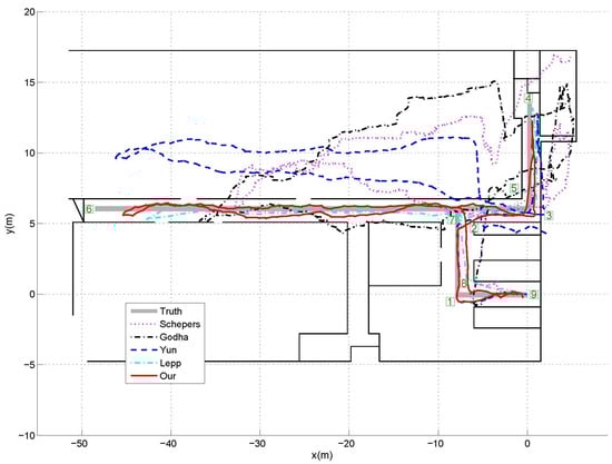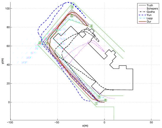 A comparison study between the state-of-the-art ZUPT-based methods and our method was carried out to evaluate the position estimation performance. In our experiments, three ZUPT-based methods were implemented, including Godha’s method [] which simply resets the velocity to zero during the stance phases; Yun’s method [] which applies a time-variant acceleration bias error to remove velocity drift; and Schepers’ method [,] which uses high pass filters to remove velocity drift. To make the comparison fairer, we also implemented the Leppakoski’s map based position estimation method []. In what follows, “Truth” represents the marked trajectory that the subjects need to follow, “Our” shows the tracking results of our method, “Lepp” indicates the performance of Leppakoski’s method, and “Godha”, “Yun” and “Schepers” stand for the corresponding ZUPT-based methods, respectively.