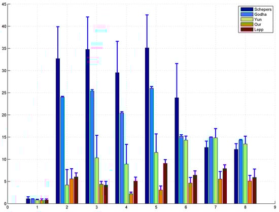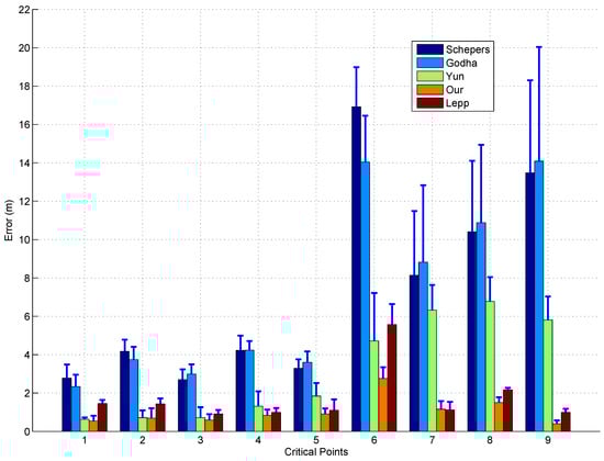 To further illustrate the strength of the proposed position estimation method, we also compared the estimation results derived from different methods with the predefined path quantitatively. In practice, it is common to assess the estimation accuracy via evaluating the positional difference between the starting and final points for the closed-loop walking patterns [,], but such evaluation may not be enough since it ignores the possible deviation of the other points from the walking path. Therefore, as indicated by the square number plates in Figure 4, all the critical turning points including the last point along the predefined path were taken into consideration in our experiment. The locations of these points were manually extracted from the position estimates provided by the four different methods, and then the distance differences between the estimated positions and actual positions of these points were calculated to evaluate the performance of different methods quantitatively. Figure 5 shows the average distance errors and standard deviations between the estimated position and actual position of the 9 critical points from the 5 trials. As can see from the figure, the distance errors have increased significantly as the walking distance increases. This is mainly because the accumulated integration drift will not only affect the current location estimation, but also affect the future location estimation as well. Therefore, once any certain location estimation has a relative large error, the error will pass to the future location estimations and make them also have large errors. Via integration of the priori map information, the accumulated integration drift can be reset, thus even when there is a location estimation with a relative large estimation error, the future location estimation is rarely affected by the error. Taking the critical point 6 for example, for all the five estimation methods, the errors at this point increase significantly over the previous 5 points, which is mainly because that the straight line distance from the original point is the largest. For the three traditional ZUPT methods, the errors at the 3 future points are also very large; however, when the priori map information is taken into consideration in our method and Lepp’s method, the errors at the 3 future points are much smaller than that at the point 6. In summary, integration of the ZUPT-based method with priori map information can achieve much better results than only applying the ZUPT alone. As can also see from the figure, our method surpassed the Lepp’s method slightly. The estimation error over all critical points by our method was 1.03 ± 0.17 m, while that from Lepp’s method was 1.74 ± 0.18 m.