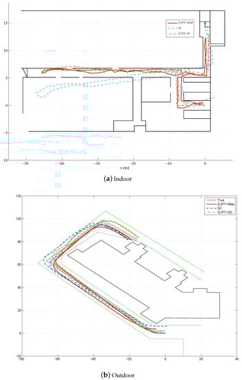 Comparative results with our previous methods presented in [] and []. (a) Indoor scenario; and (b) Outdoor scenario. For both figures, “ZUPT+SC” is for fusion of ZUPT and step counter presented in [], “SC” is for the step counter method presented in [], and “ZUPT+Map” is for fusion of ZUPT and map proposed in this paper.