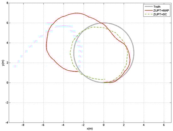 In order to get good location estimation results, motion-induced linear acceleration should be derived as accurate as possible by Equation (3), which depends on the performance of orientation estimation algorithm. In our implementation, we applied our previous method proposed in []. In general, such a method can provide accurate orientation estimation (less than 3° RMS error). However, there are definitely some errors in the orientation estimation, particularly when the strong linear acceleration interference and the magnetic disturbance last for a long time. The main reason is due to the inevitable gyroscope integration drift. When the interference and the disturbance exist, our method relies on the gyroscope measurement only, and accelerometer and magnetometer measurements are not able to compensate the gyroscope integration drift. Thus, we have to explore different methods, such as ZUPT and the map information, to compensate for the errors existed in the derived motion-induced linear acceleration for good position estimation.