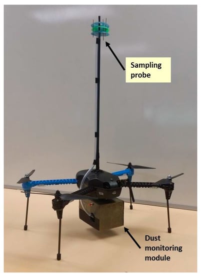 Physical configuration of the multi-rotor UAV with the sampling probe and dust monitoring module attached.