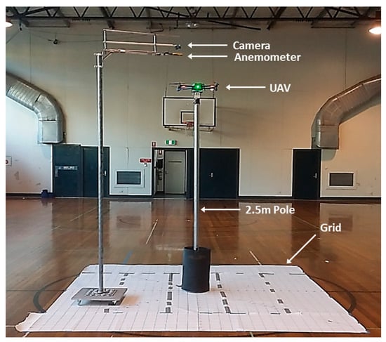 For the aerodynamics experiment, the UAV was placed indoors and mounted on a 2.5 m pole. Measurements were taken with a Kestrel 2500 anemometer (Minneapolis, MN, USA) which was positioned around the UAV following a grid pattern at different x, y and z positions (Figure 3). With the readings collected, a 3D visualization map was generated to observe the airflow produced by the propeller downwash and upwash (Figure 4).