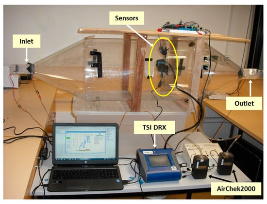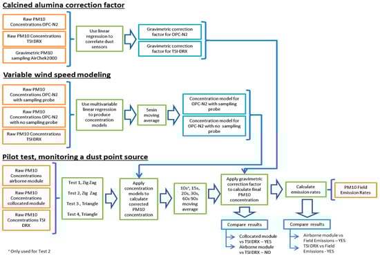 In Figure 8, the process to obtain the correction factors is presented as a flow diagram. This diagram also summarises the other two experiments conducted to validate the readings of the dust monitoring sensors. These experiments are described in the following sections.