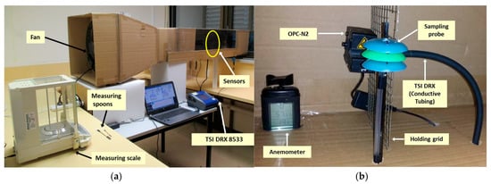 Wind tunnel and equipment used for the variable wind speed tests, (a) overall view of the wind tunnel and equipment used; and (b) test area set with the anemometer, probe, OPC-N2 and TSI DRX.