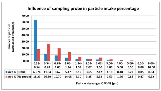 Influence of the sampling probe used with the OPC-N2 over particle counting readings per particle size range.