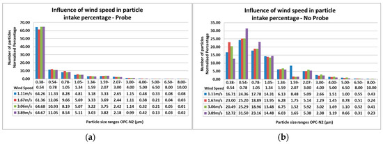 Influence of wind speed variation over particle counting readings per particle size range for (a) OPC-N2 with a sampling probe attached; and (b) OPC-N2 without a sampling probe.